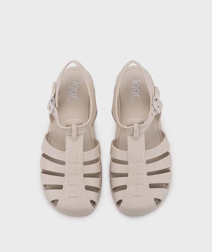 Cangrejera diseñada en concepto barefoot medium, cero drop, flexible y blandita, fabricada con al menos un 50% de pvc reciclado libre de ftalatos y cierre de hebilla ajustable.