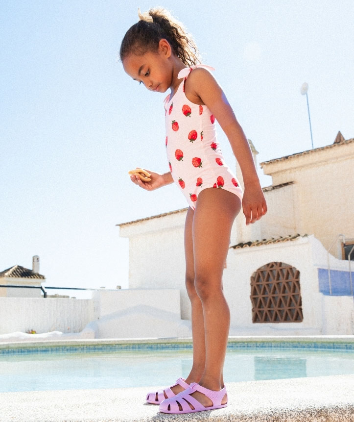 Cangrejera diseñada en concepto barefoot, cero drop, flexible y blandita, fabricada con al menos un 50% de pvc reciclado libre de ftalatos y cierre adherente.