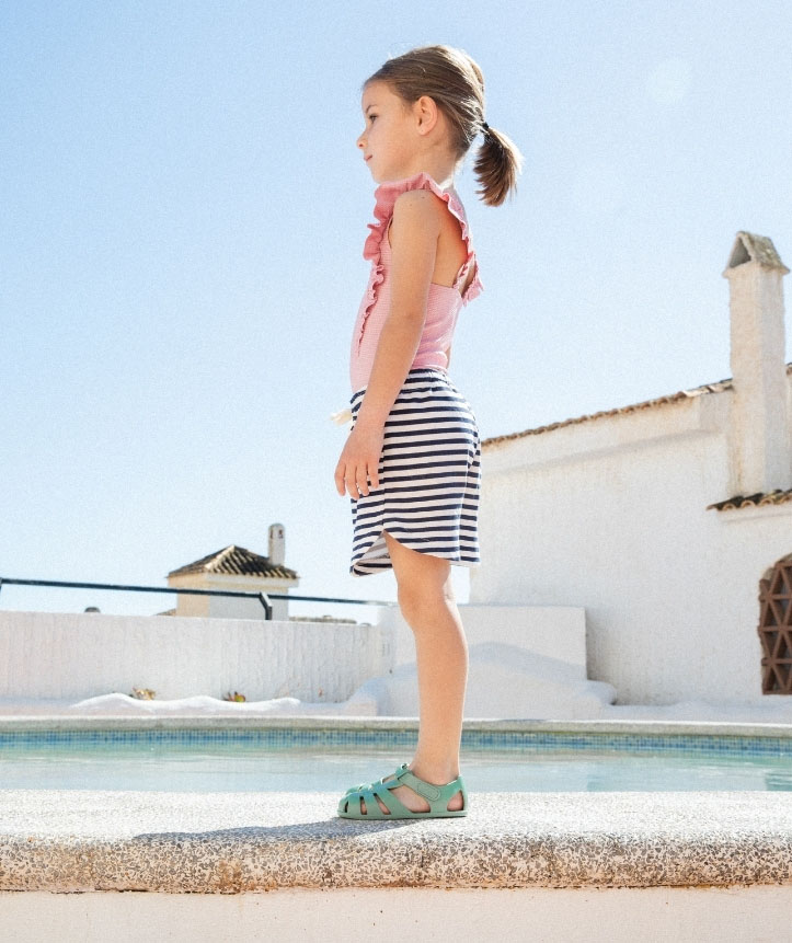 Cangrejera diseñada en concepto barefoot, cero drop, flexible y blandita, fabricada con al menos un 50% de pvc reciclado libre de ftalatos y cierre adherente.