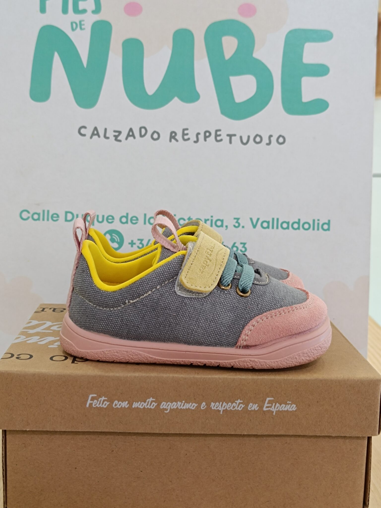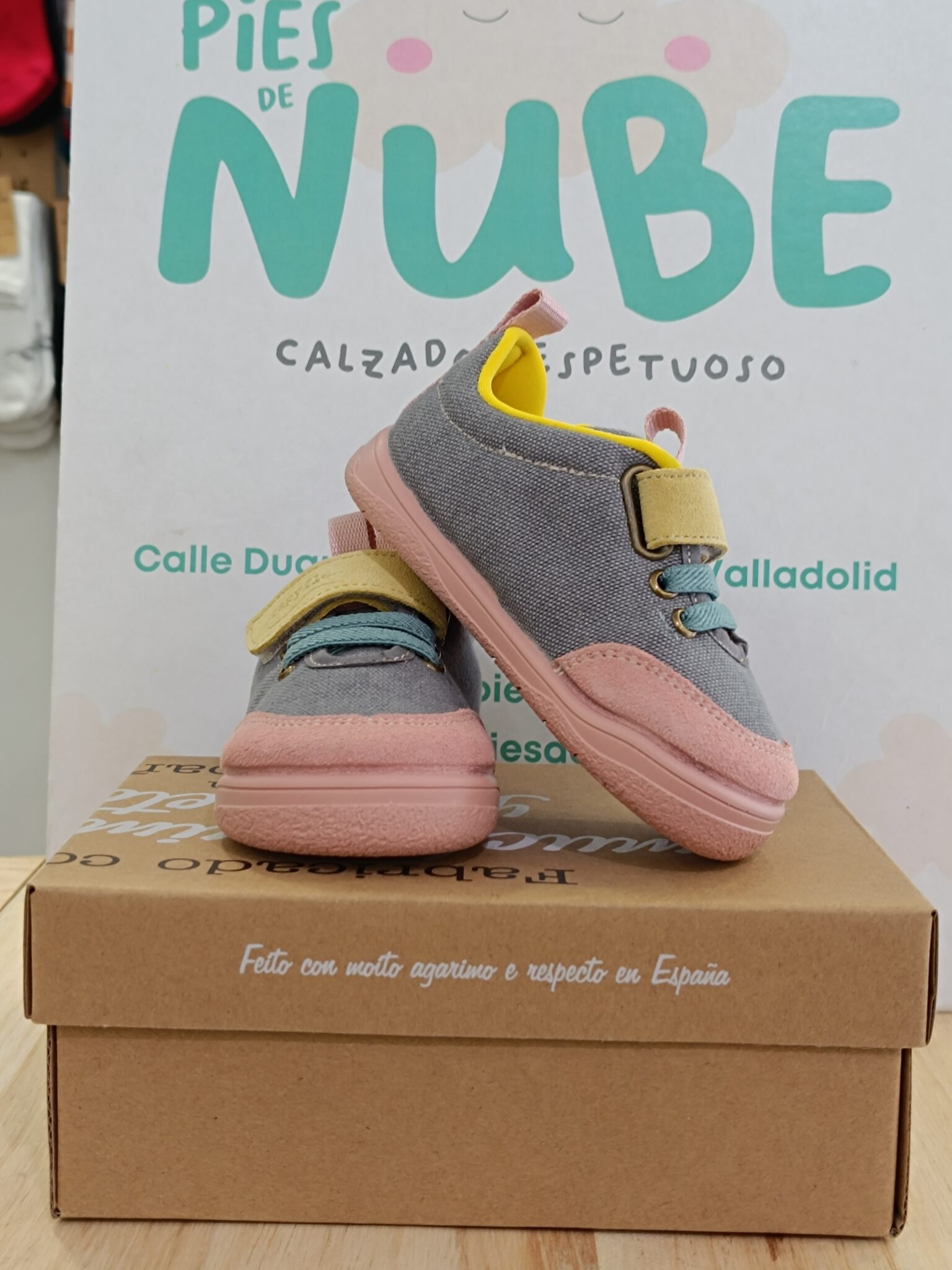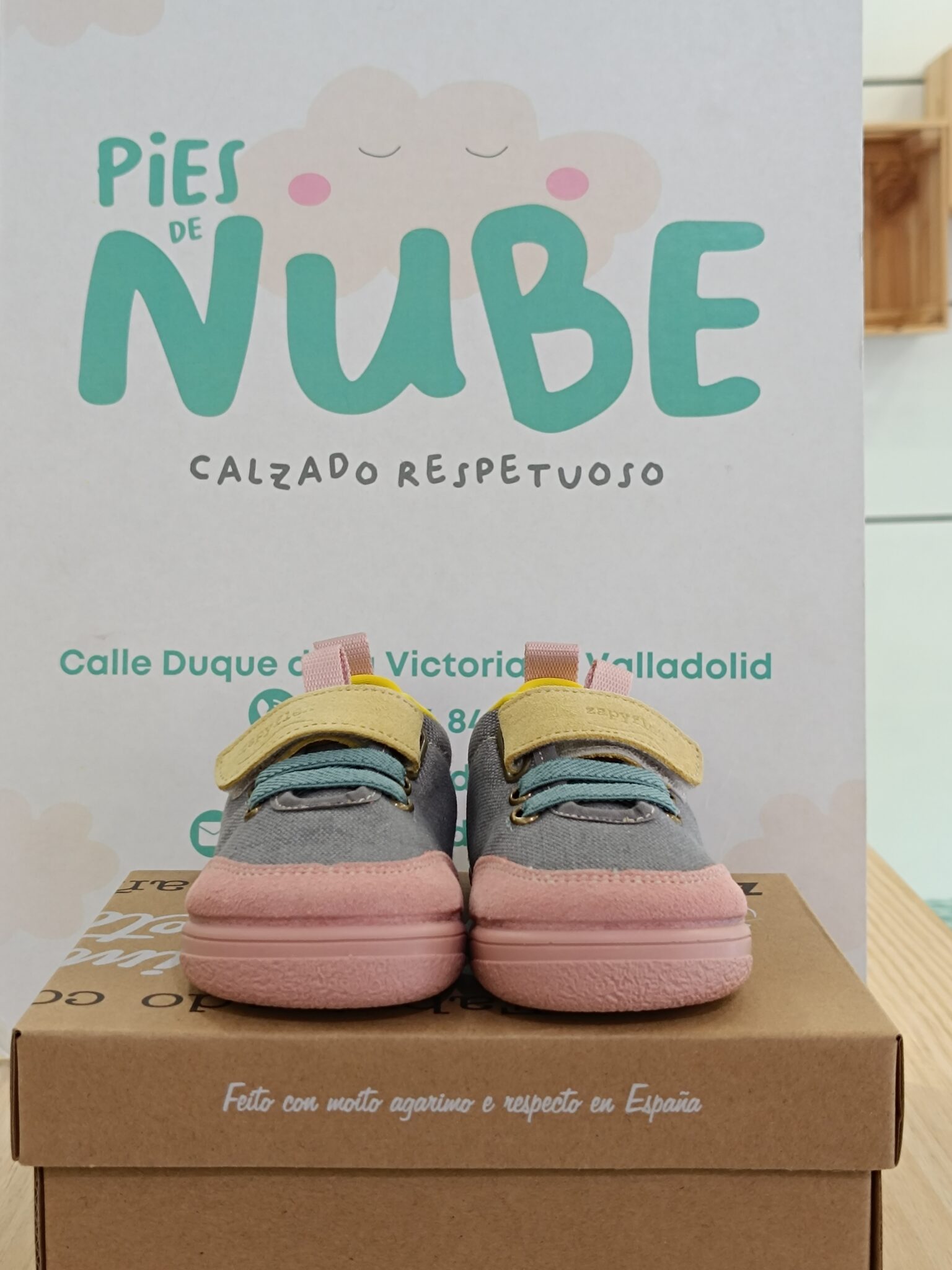 Suela fina y antideslizante, materiales blandos y transpirables, toe box ancho, sin refuerzos y con velcros para fomentar la autonomía.