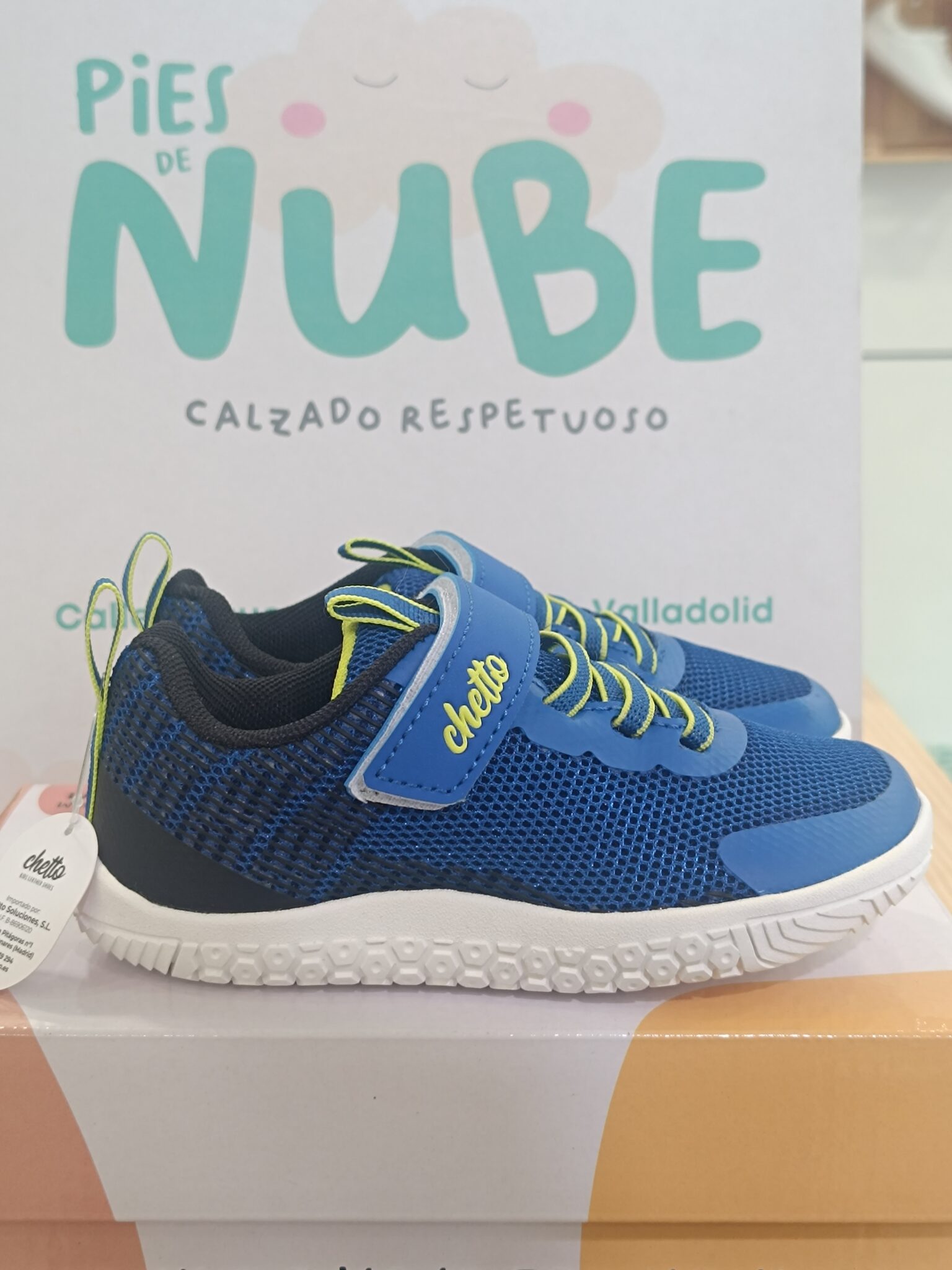 Suela fina y antideslizante, materiales blandos y transpirables, toe box ancho, sin refuerzos y con velcros para fomentar la autonomía.