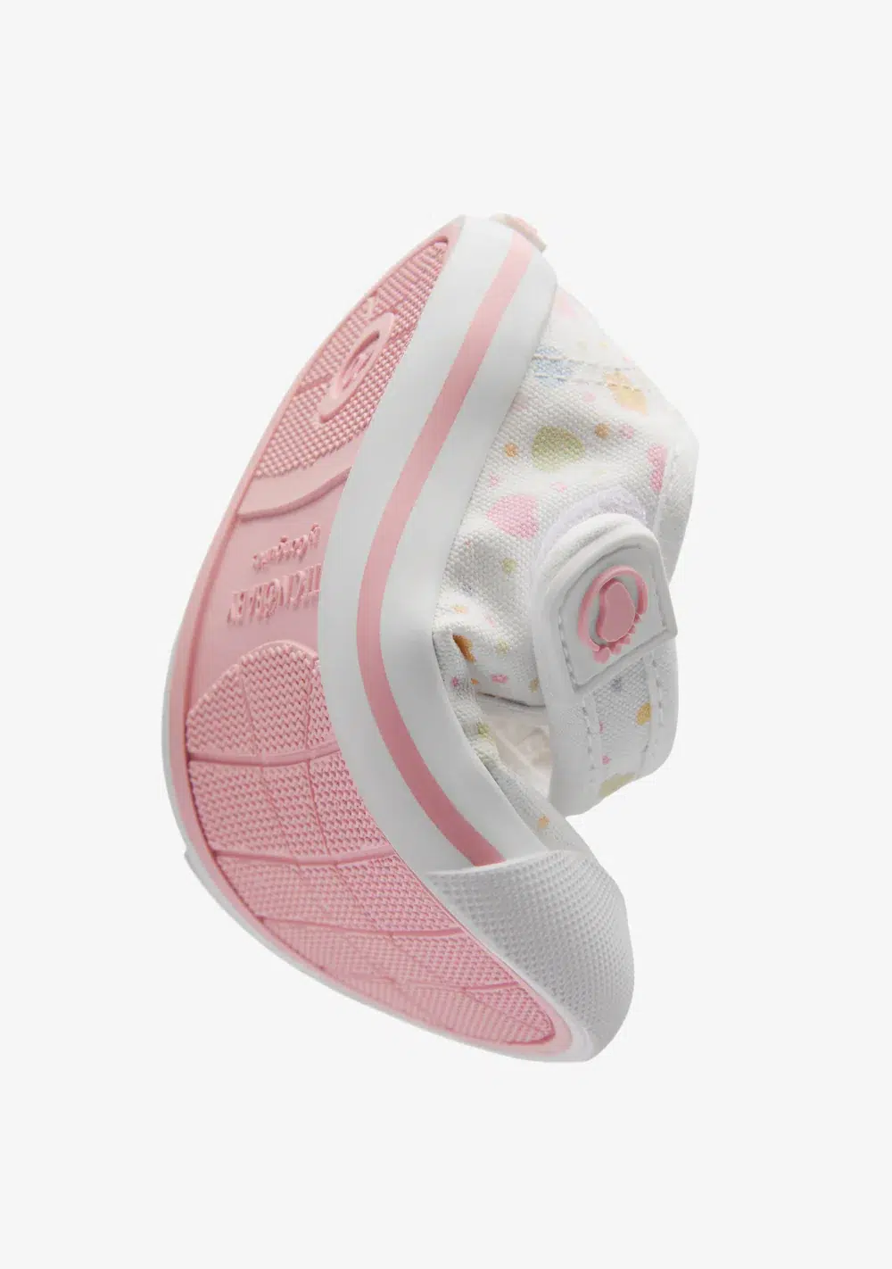 Merceditas barefoot en lona blanca con estampado de flores multicolor en suaves tonos pastel. Un diseño tipo bailarina deportiva ideal para primavera/verano, ligero y fácil de combinar. Su cierre de tira adherente permite poner y quitar en segundos, con un ajuste cómodo y seguro para el día a día.