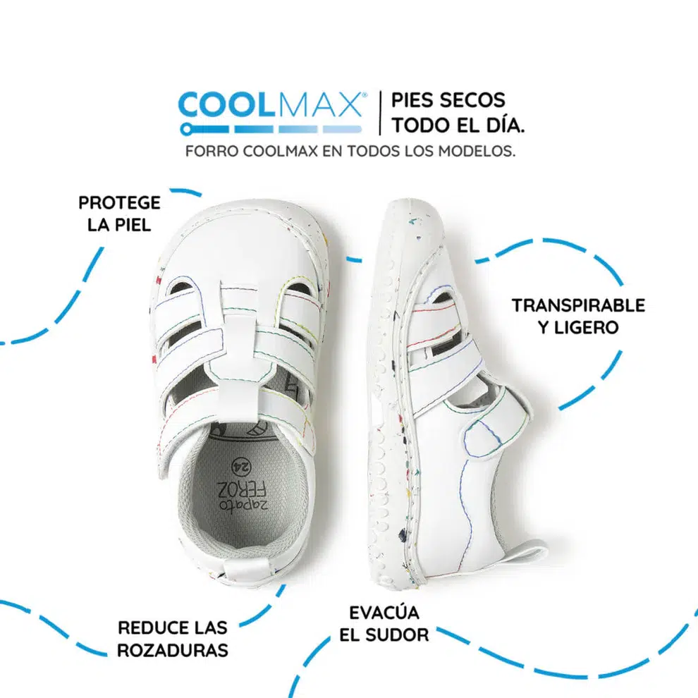 Suela fina y antideslizante, materiales blandos y transpirables, toe box ancho, sin refuerzos y con velcros para fomentar la autonomía.