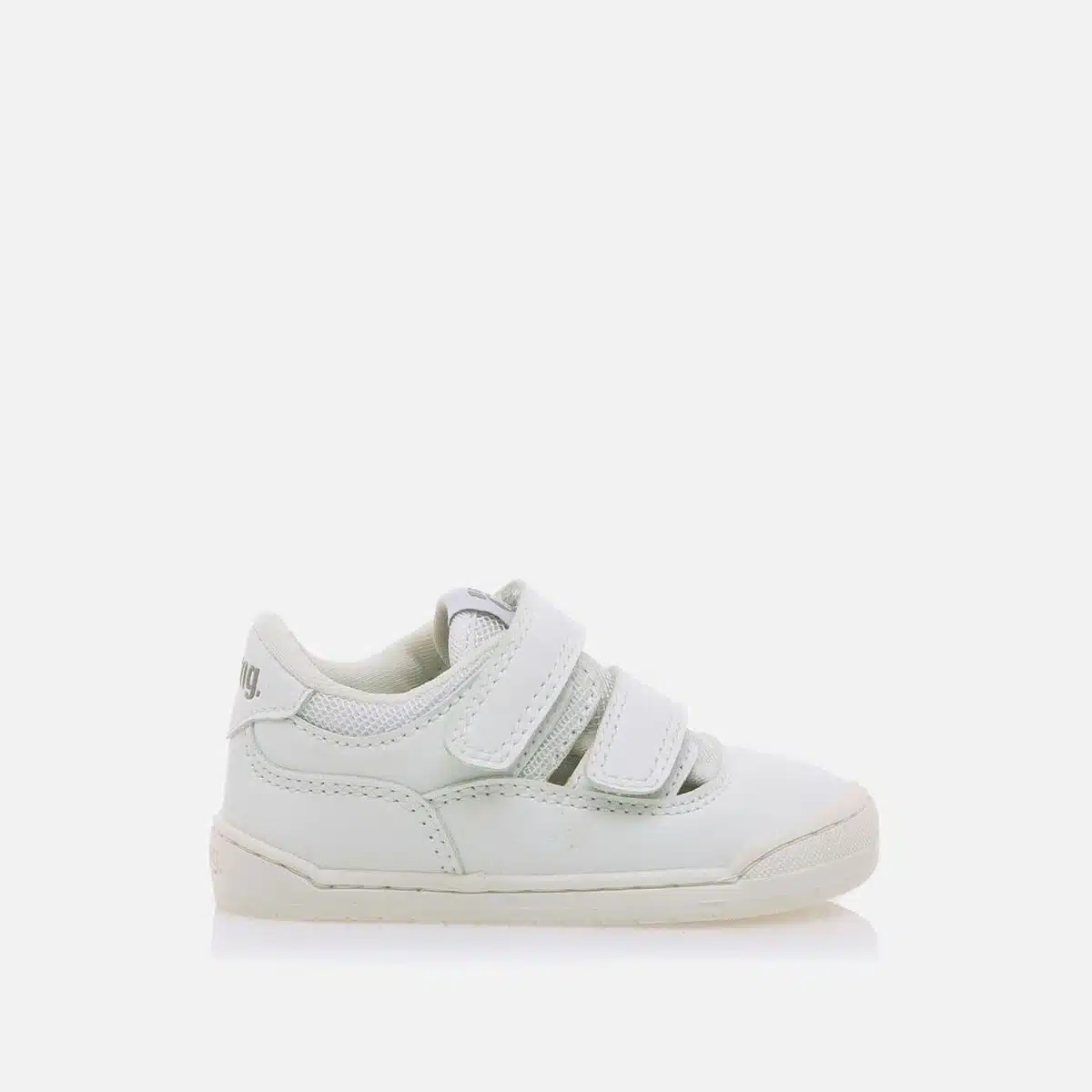 Zapatillas de color blanco para bebé de la marca Mustang, modelo Free baby diseñados con malla perforada y detalles en material liso. Este modelo combina un diseño moderno con aperturas laterales, ofreciendo transpirabilidad y comodidad para el uso diario. El cierre doble adhesivo asegura un ajuste firme y práctico. Con certificado VEGANO sellado por INESCOP, el cual garantiza que la naturaleza química principal del material no se corresponde con fibras de origen animal.