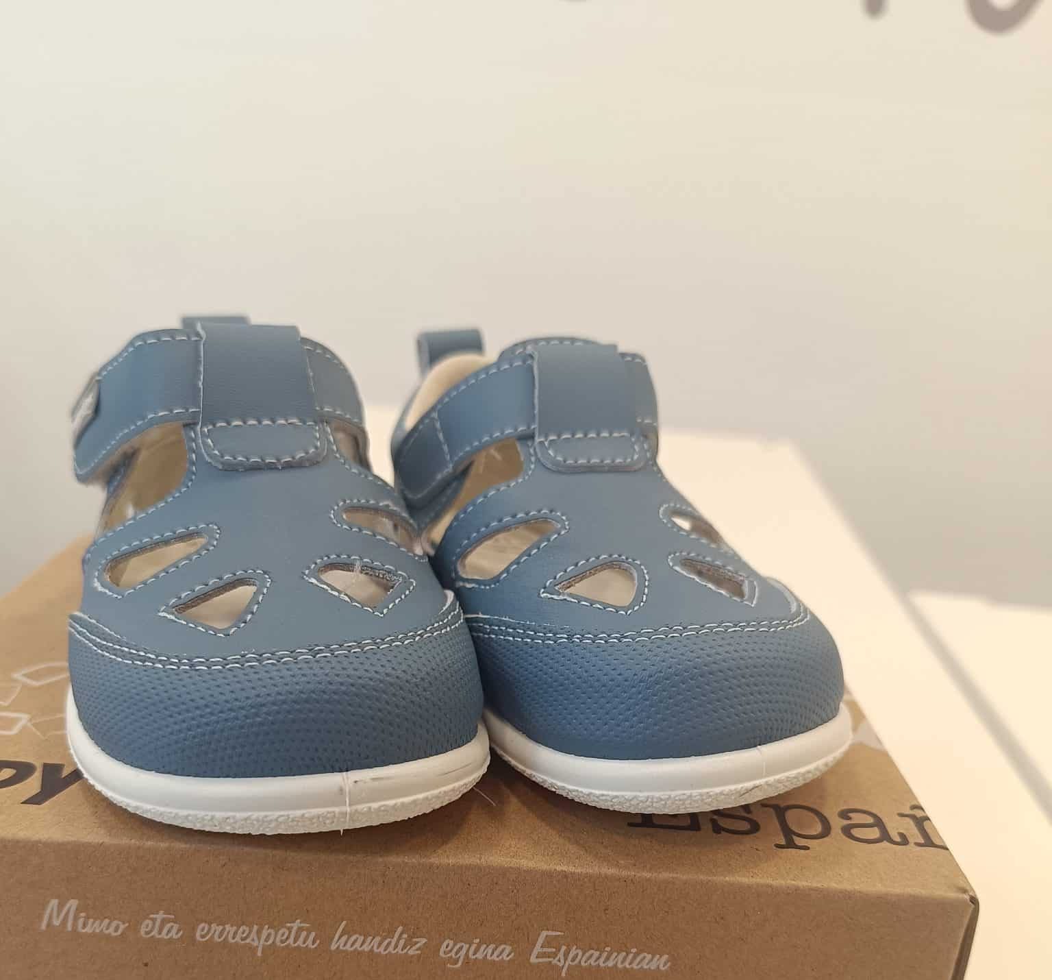 Suela fina y antideslizante, materiales blandos y transpirables, toe box ancho, sin refuerzos y con velcros para fomentar la autonomía.
